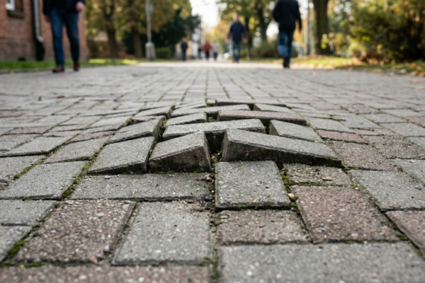 W prawidłowo wykonanym bruku siły nacisku przenoszą się na boki – każda kostka wspiera się na innych dzięki odpowiedniemu zaklinowaniu. Tarcie między bryłami utrzymuje całą płaszczyznę w ryzach. Gdy ten system zawodzi, poszczególne bryły zaczynają pracować w izolacji od reszty. Z czasem luzy stają się coraz większe, a chodnik traci swoją pierwotną spójność i nośność.